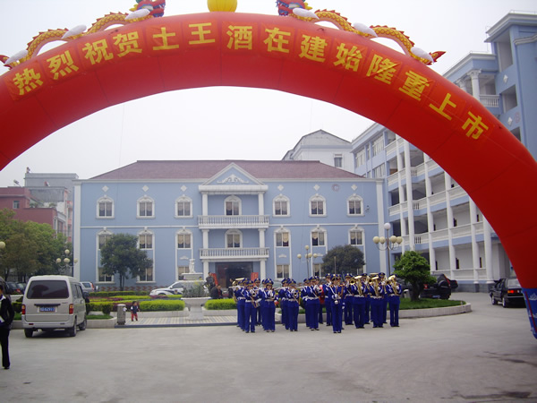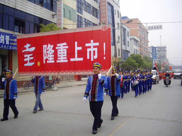 上午8时30分,四名土家男子抬着“土王酒隆重上市”的标志牌,在土王酒业军乐队、建始县老年腰鼓队的伴奏曲中,在建始的大街小巷进行了长达2小时的游行,每到一处,都挤满了相互传颂的群众。